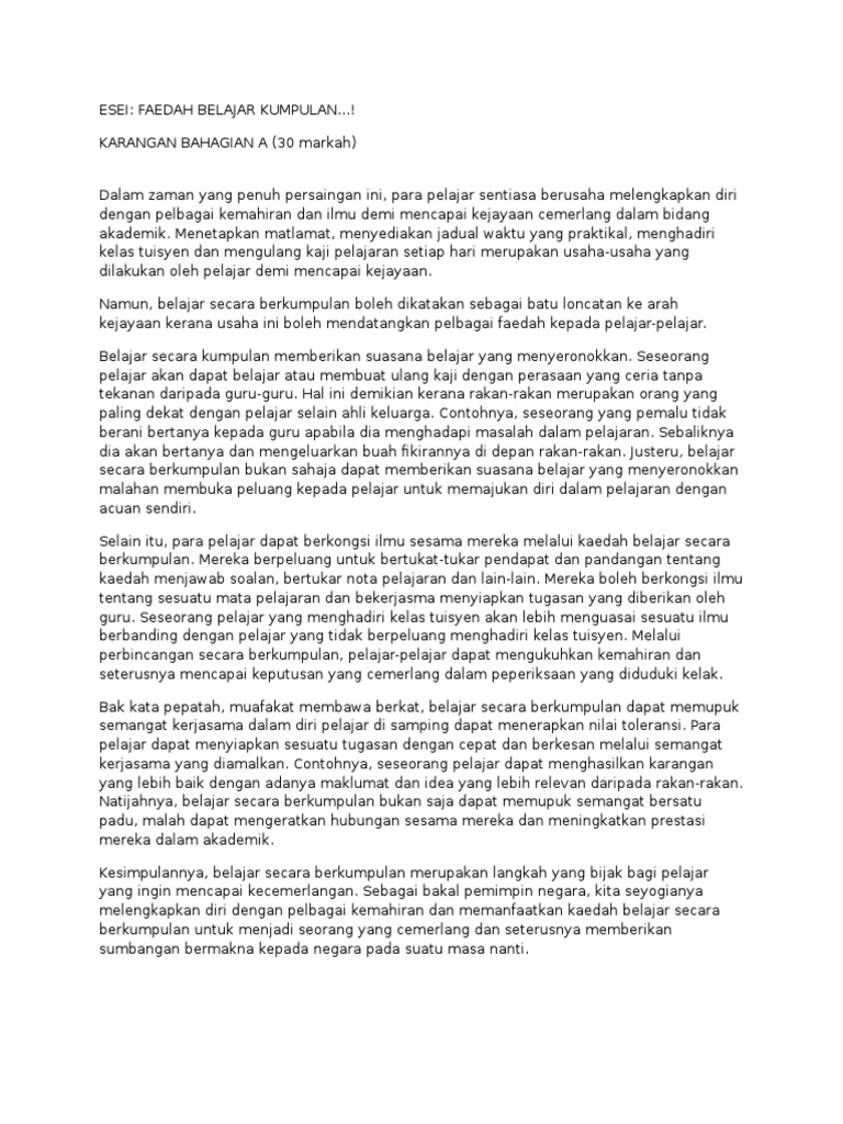 Belajar secara berkumpulan dapat meningkatkan pemahaman murid terhadap pelajaran. Contoh Karangan Kebaikan Program Motivasi. Kita boleh belajar secara kumpulam di dalam dan luar kelas.